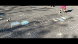 Alors, nous avons décoré la cour avec des craies : nous avons dessiné des fleurs avec de belles couleurs, des oiseaux mais aussi des arbres…Nous avons beaucoup aimé décorer la cour !
